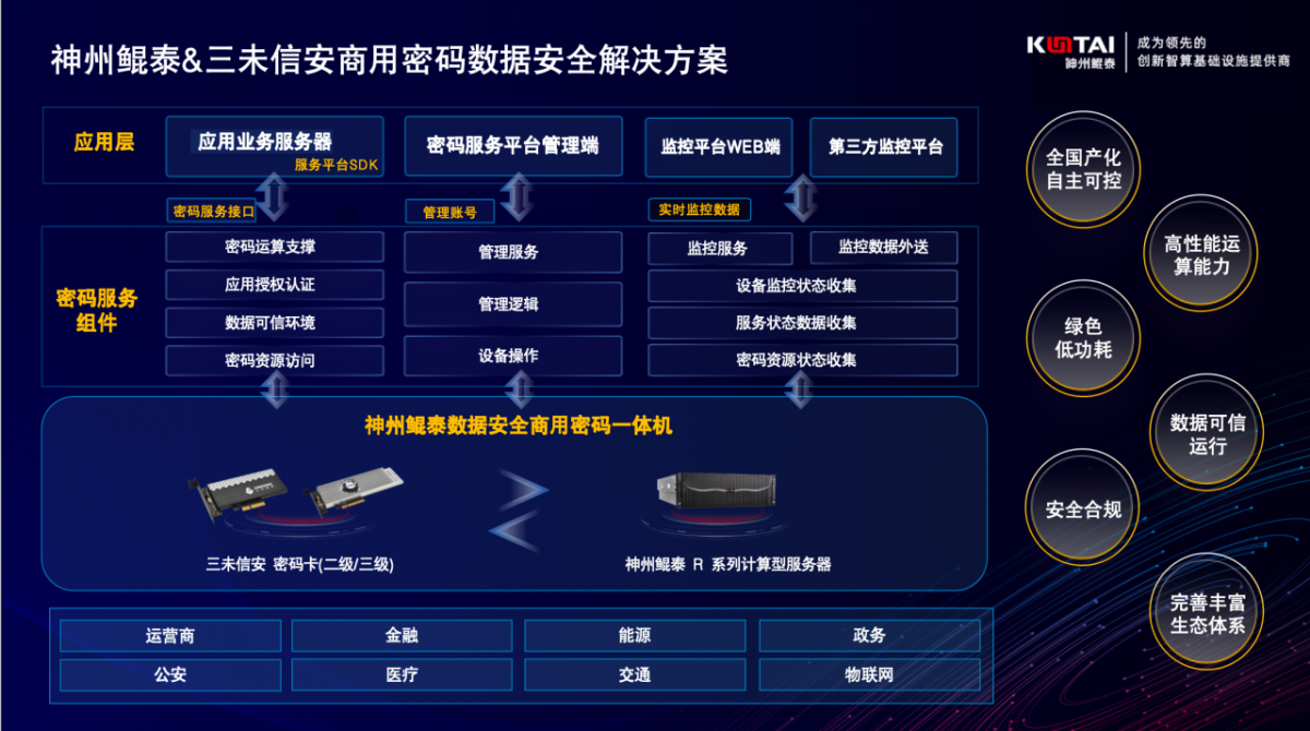 面向通用领域,该方案可为政府、能源、医疗、教育等多行业的各类信息系统提供商用密码安全防护。基于全国产化密码运算能力和安全的密钥管理机制,针对OA、网站群、云平台等业务系统提供数据的加密解密、签名验签、数据摘要等功能。可为关键信息基础设施,以及云计算、大数据、物联网、人工智能等前沿领域,提供全面、高效、安全、合规的数据与密码融合服务,全方位护航数字化业务发展。