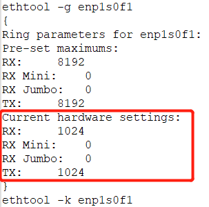 举例:ethtool –G eno1 rx 8192 tx 8192