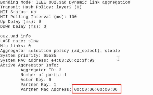 3.查看bond信息cat /pro/net/bonding/bond1,显示MAC地址是全0,表示LACPDU报文存在问题。