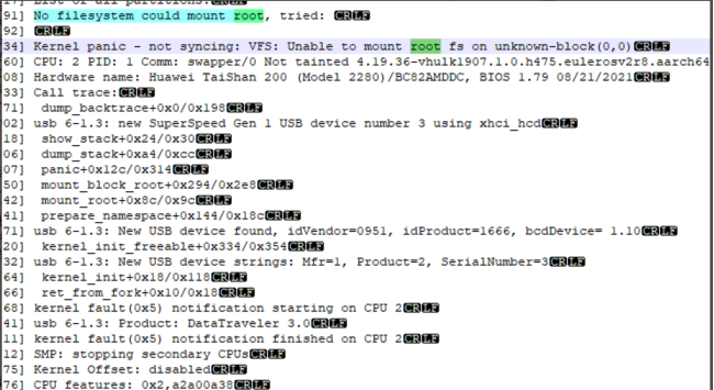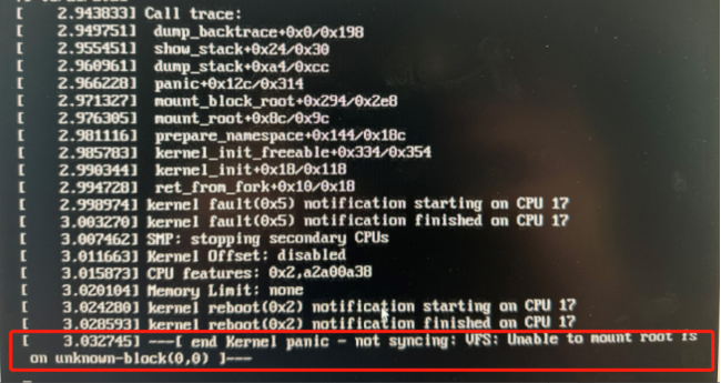 2、 查看串口启动日志,发现OS异常卡死,有 No filesystem could mount root报错,提示根文件系统挂载失败,进而导致OS崩溃卡死,无法正常安装