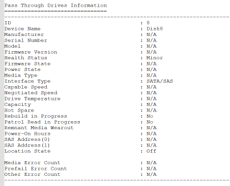 1. 查看硬盘状态,发现告警槽位的硬盘状态信息全为N/A,未识别到。