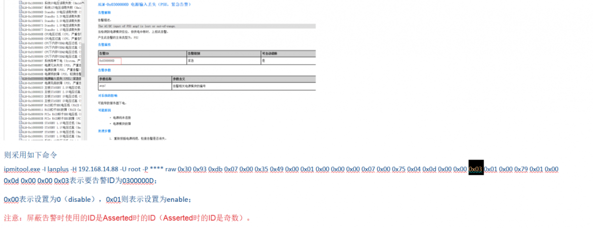 ipmitool.exe -H 10.72.73.24  -U Administrator -P Mima94g8z! -I lanplus raw 0x30 0x90 0x58 0x01 0x00 0x06 0x00 0x49 0x00 0x00 0x1a 0x00 0x01  (红字后几位为告警ID倒序)
