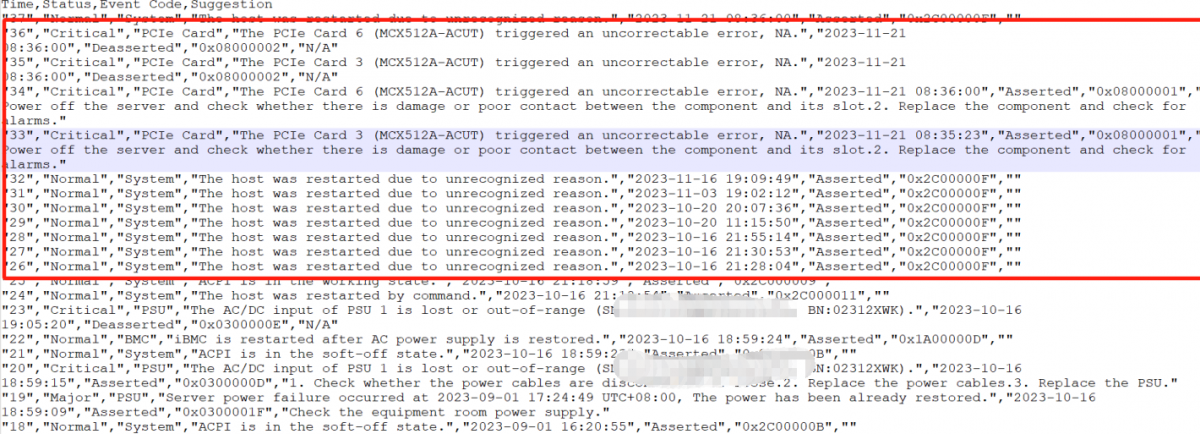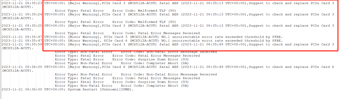 1. 分析sel事件日志记录,发现日志打印设备存在因未知原因异常重启的记录,同时伴随有PCIE Card3/6 UCE报错告警。