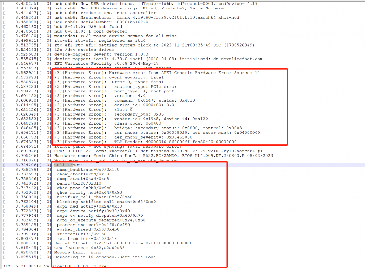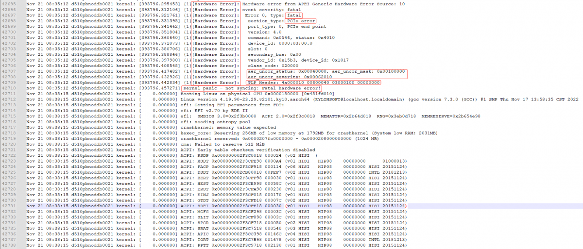 5. 分析systemcom 系统串口日志,发现系统异常重启前伴随有系统call trace触发,且存在Hardware error报错,错误类型fatal error、Malformed TLP AER。