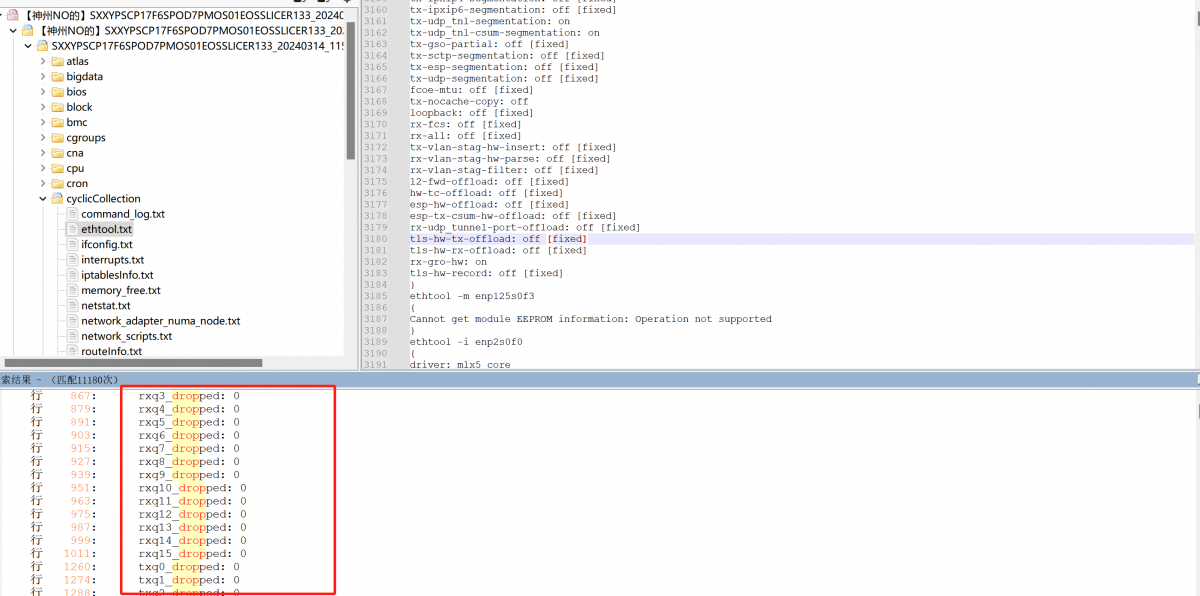3. 进一步分析ethtool参数,发现ethtool -S下dropped数量均为0,结合上述日志可初步推断网卡硬件与驱动层面没有错包、丢包与buffer不足溢出问题。