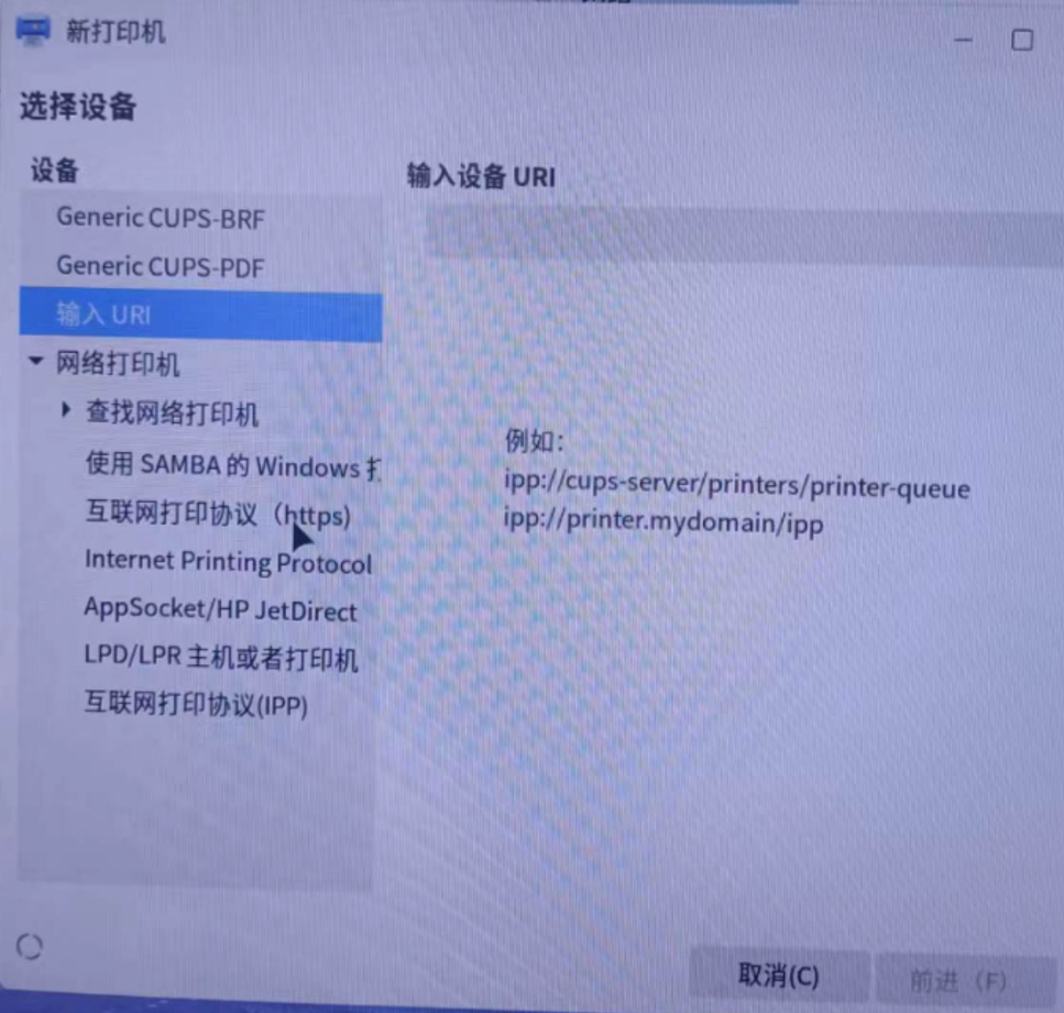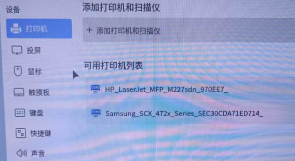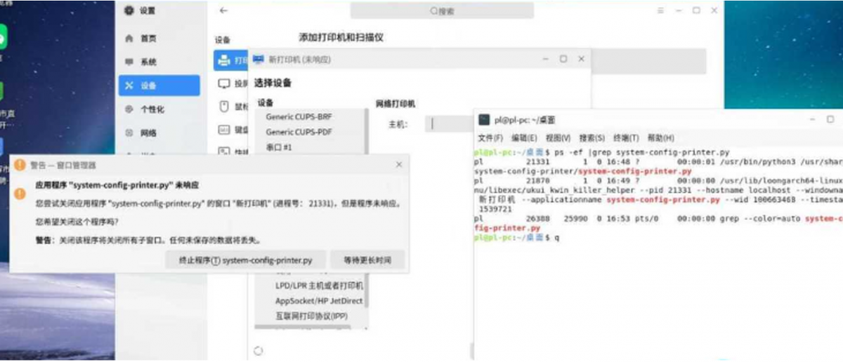 控制中心-设备-打印机:可打印机列表有连接的hp和三星打印机,但是点添加打印机,弹出来的窗口点击以后 窗口会卡住。